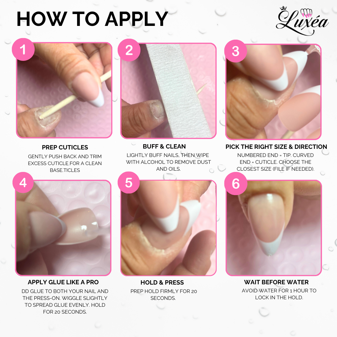 Prep Nails: Clean with an alcohol pad and dry buff for smooth adhesion.